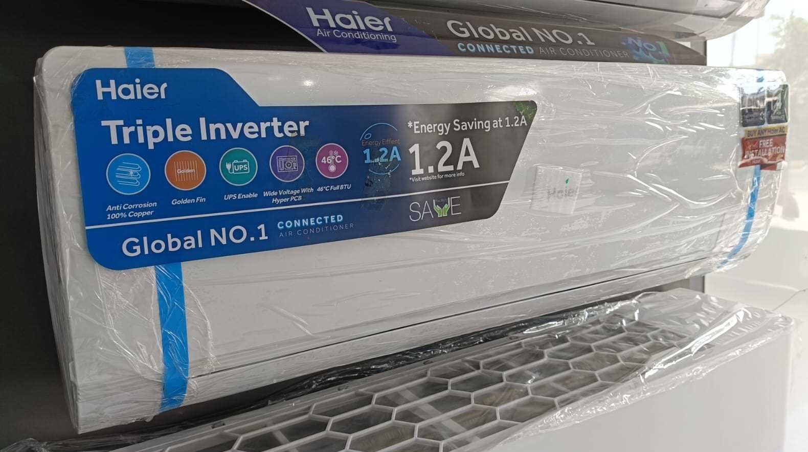 Haier’s HSU-19HFC air conditioner boasts triple inverter technology, offering efficient cooling and heating. This model comes in both 1-ton and 1.5-ton capacities to suit your space requirements. The Haier Triple Inverter includes an inverter compressor, blower, indoor unit, and outdoor unit for optimal performance and energy savings. It features an anti-rust coating for durability and an auto-clean function that eliminates the need for manual cleaning or frequent service calls. Purchase yours today from the official Haier store at Lahore Electronics.